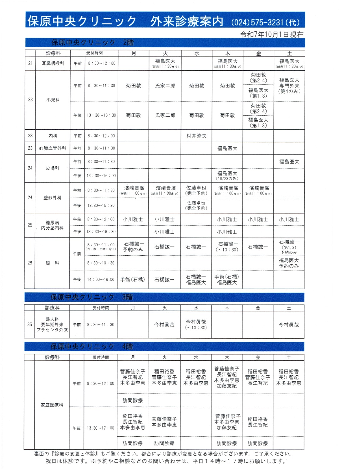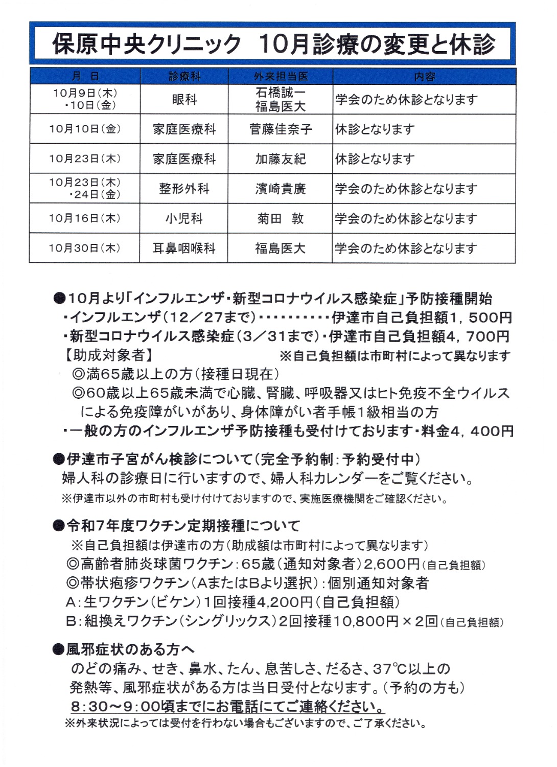 令和7年10月 保原中央クリニック診療変更と休診案内