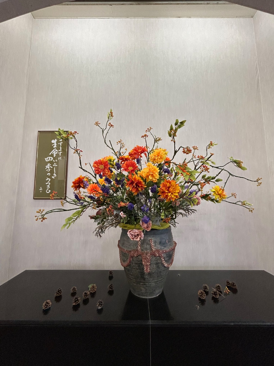 正面玄関を入ったところにフラワーアレンジメントを飾っています。秋バージョンにかわりましたので、来院の際は是非ご覧ください。オレンジ:ガーベラ黄色:ダリアローズ:バラ紫:ラベンダー実:ナナカマド