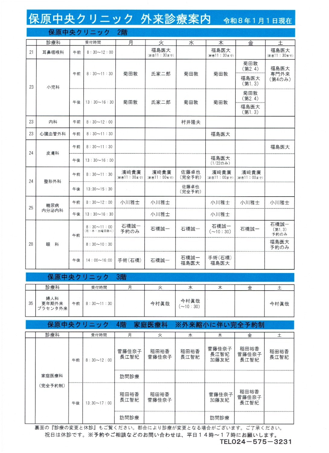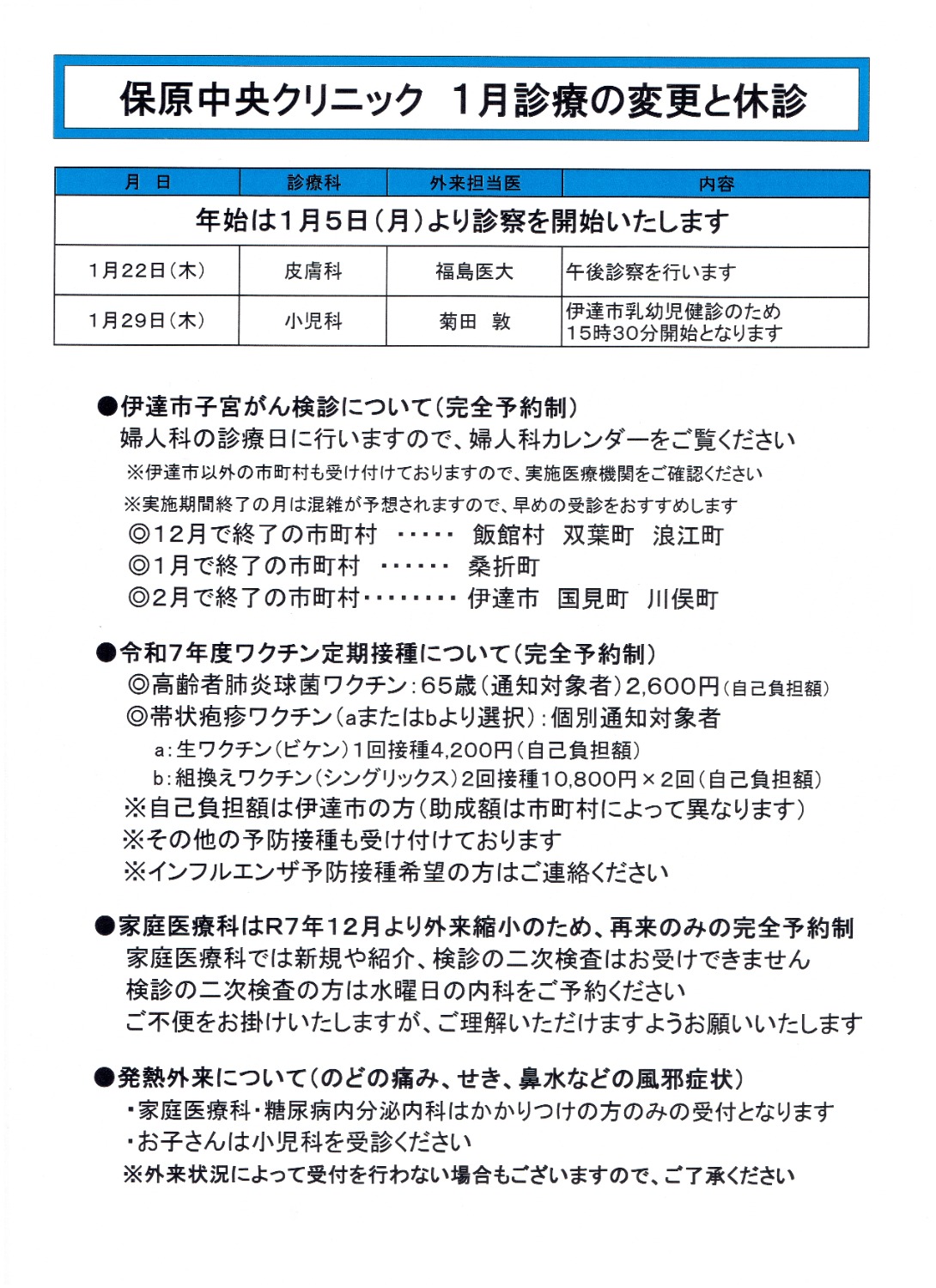 令和7年12月保原中央クリニック外来診療変更と休診案内