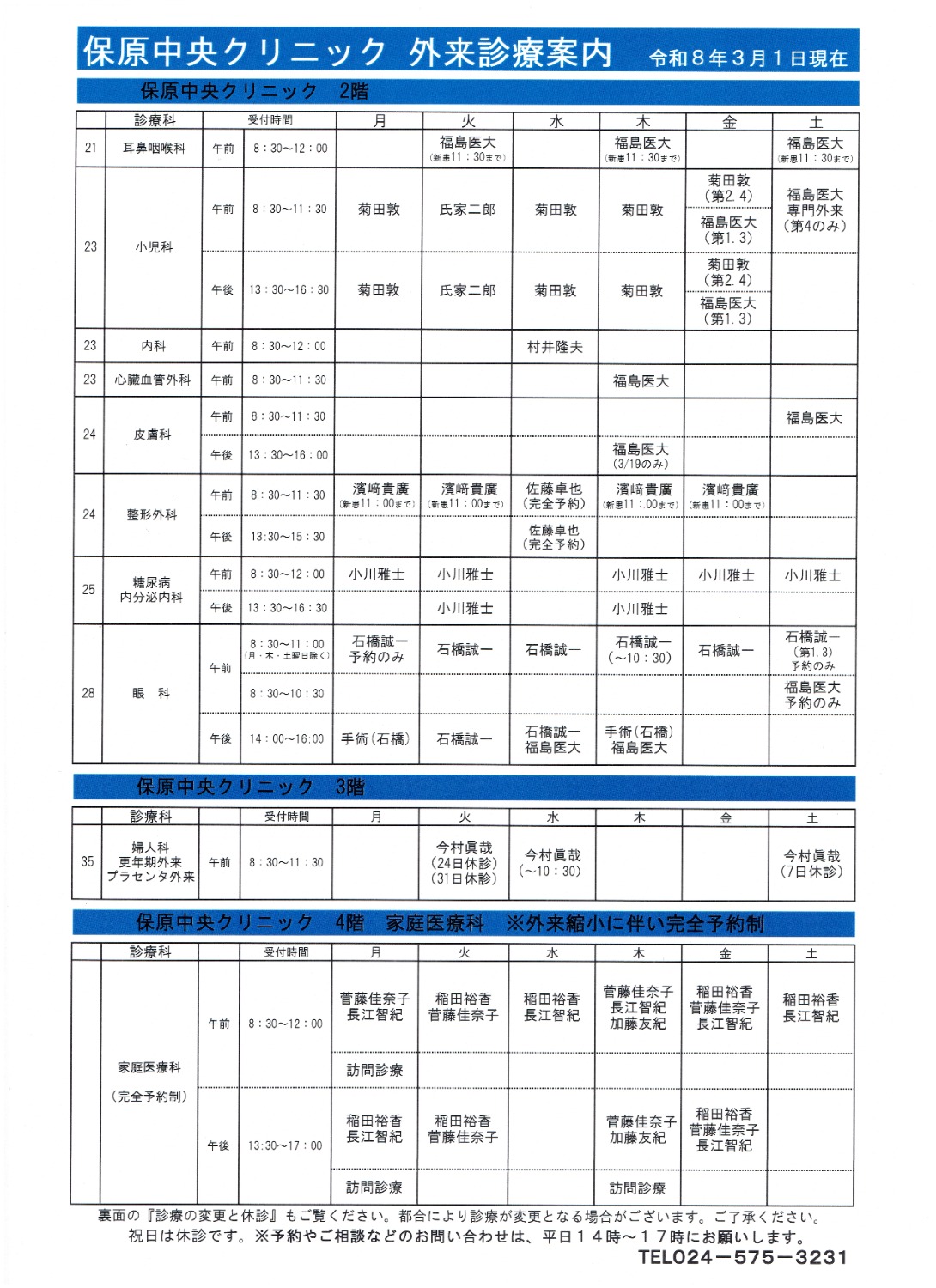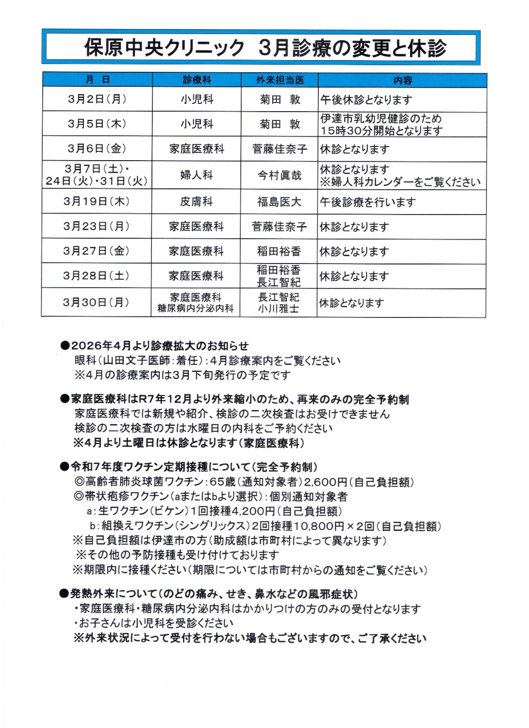 令和8年3月 保原中央クリニック診療の変更と休診案内