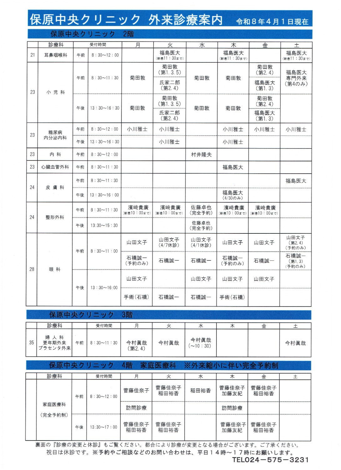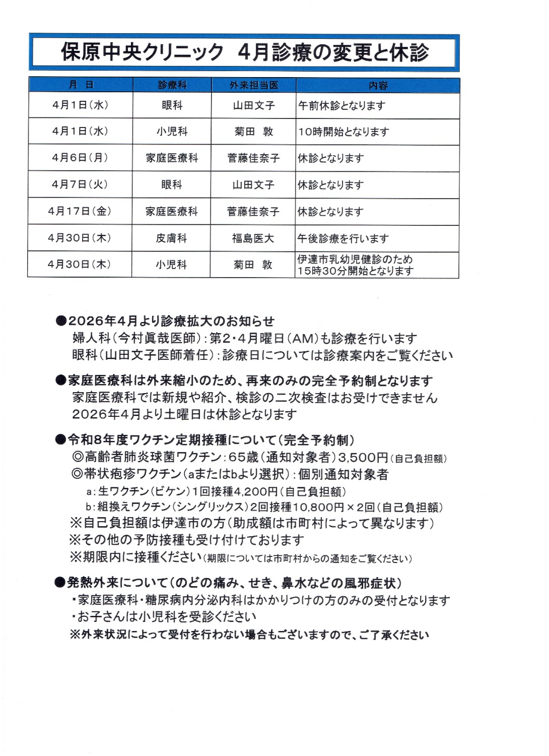 令和8年4月 保原中央クリニック診療変更と休診案内