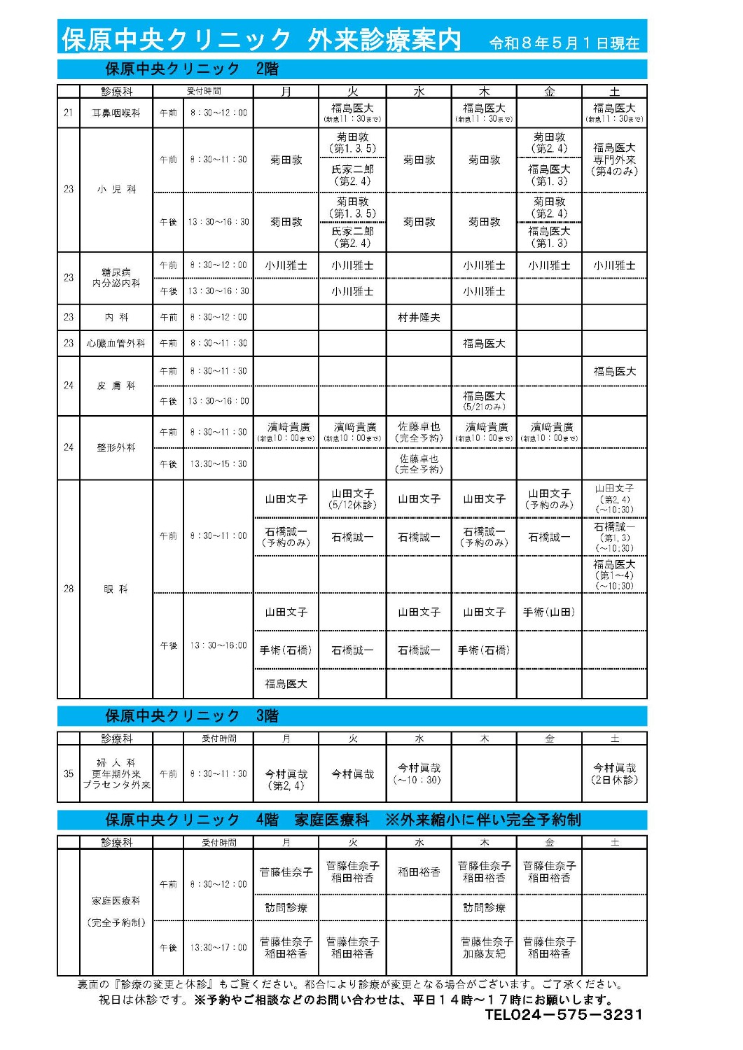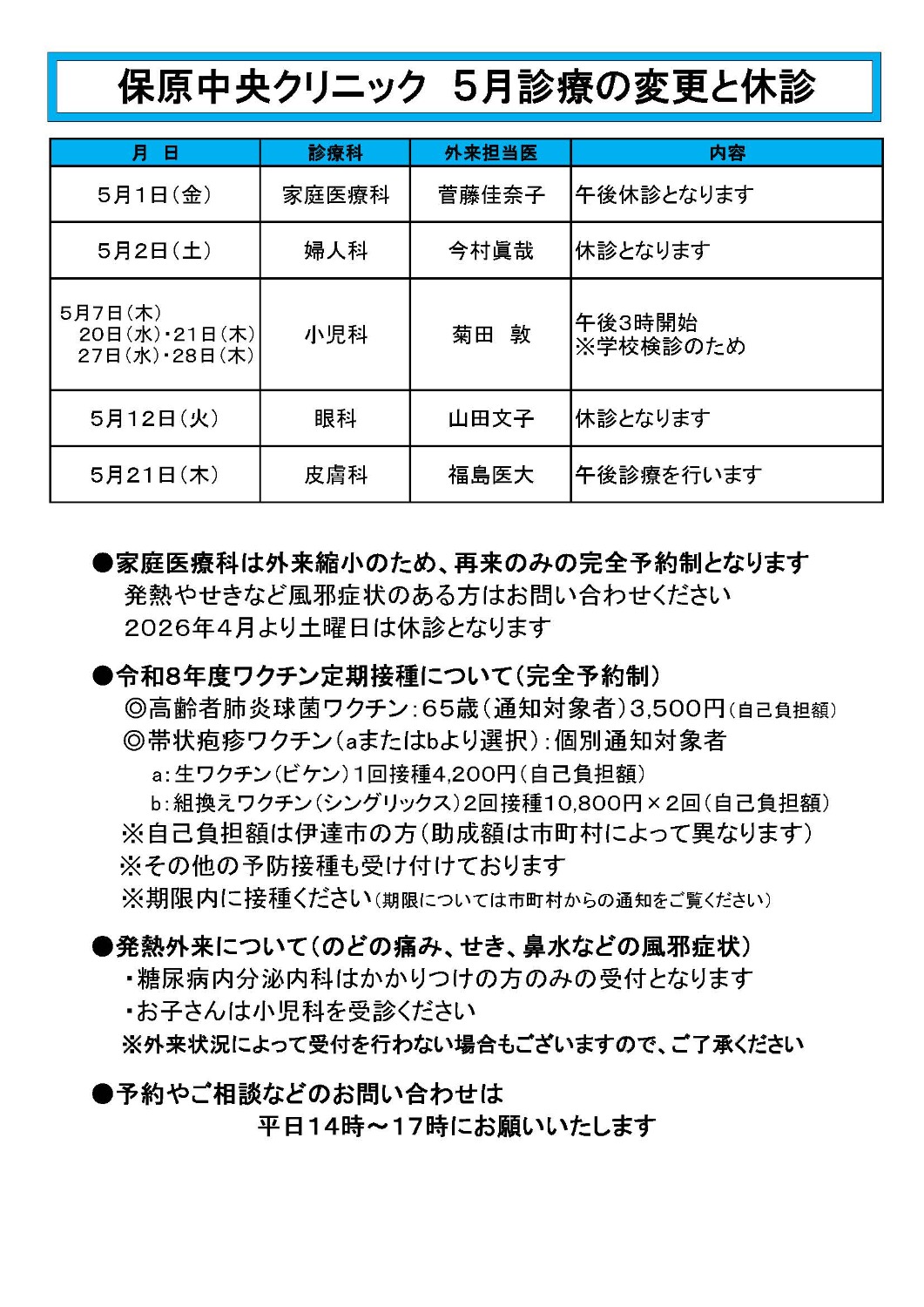 令和8年5月 診療の変更と休診(保原中央クリニック)