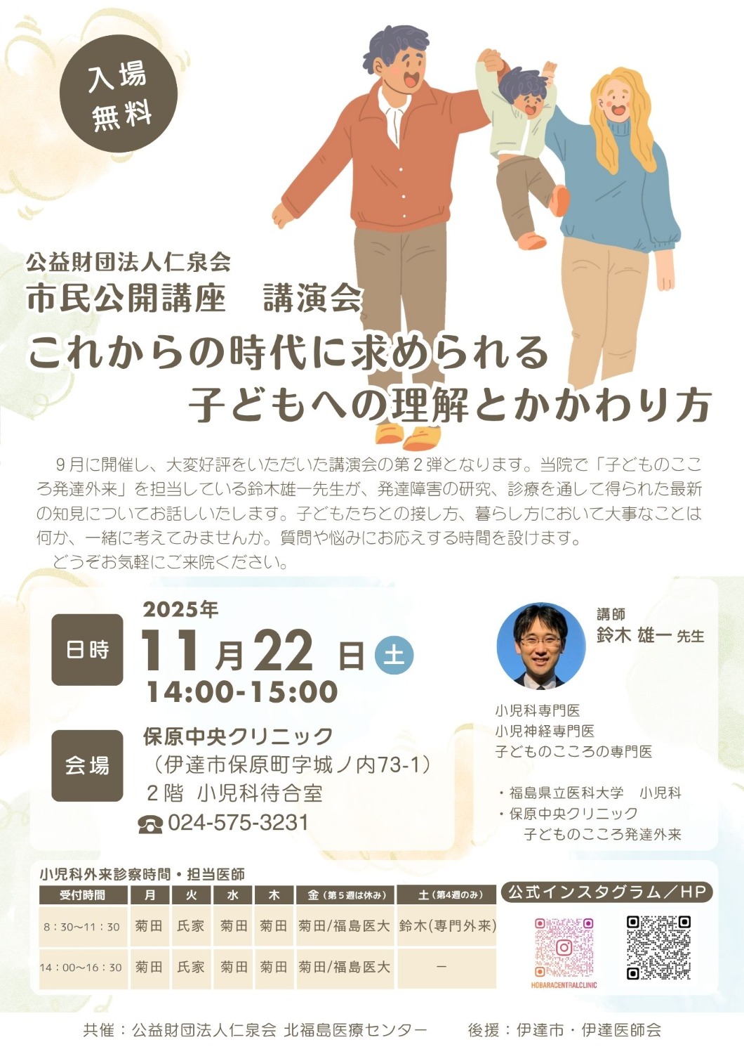 第2回市民公開講座 講演会 ~これからの時代に求められる子どもへの理解とかかわり方~ 日時 2025年11月22日(土) 14:00~15:00(13:30受付開始) 会場 保原中央クリニック 2階 小児科待合室 講師 鈴木雄一先生 ・福島県立医科大学 小児科 ・保原中央クリニック 子どものこころ発達外来 その他 入場無料 申し込み不要 駐車場あり 9月に開催し、大変好評をいただいた講演会の第2弾です。 当院で「子どものこころ発達外来」を担当している鈴木雄一先生が、発達障害の研究や診療を通して得られた最新の知見についてお話しいたします。 子どもたちとの接し方や暮らし方で大切なことは何か、一緒に考えてみませんか。 ご質問やお悩みにお応えする時間も設けます。 どうぞお気軽にご来院ください。 公益財団法人仁泉会 保原中央クリニック