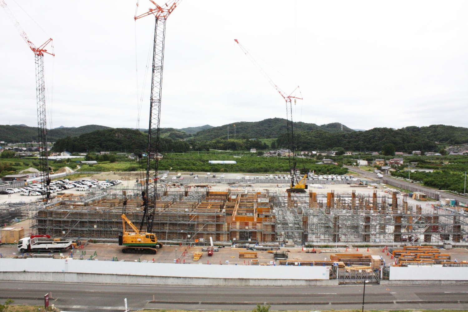 新病院の工事は順調に進み、病棟の骨組みが少しずつ姿を現してきました。現場では毎日、多くの作業員の方々が安全第一で作業を進めてくださっています。