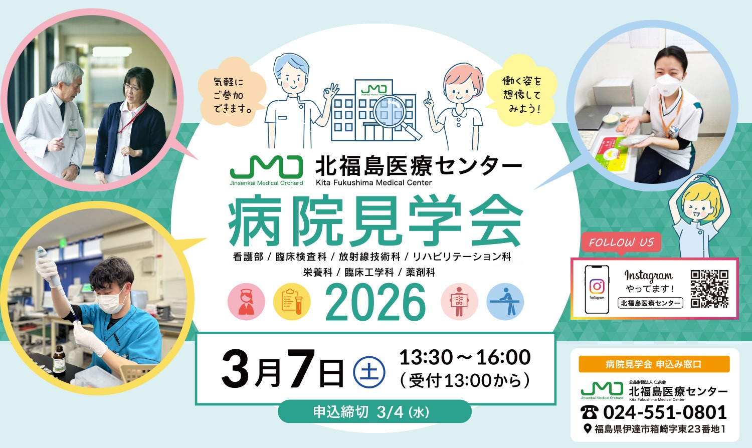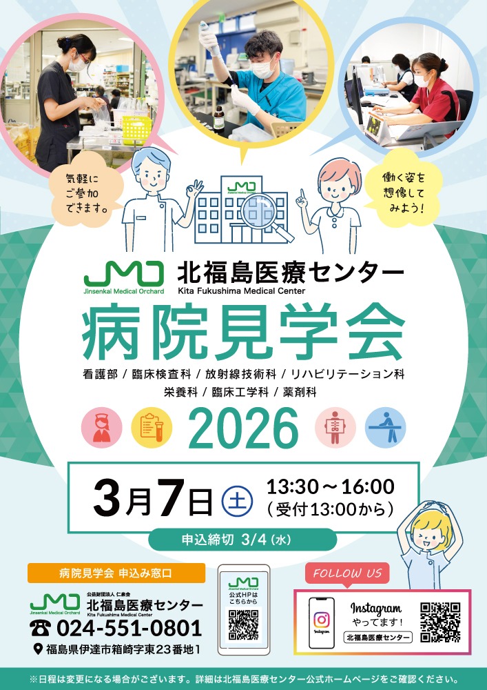 2026年3月7日(土) 多職種合同 「病院見学会2026」のお知らせ 北福島医療センターでは、2026年3月7日(土)に多職種合同 病院見学会を開催いたします。 本見学会は、各職種の養成校で学ぶ学生を対象に、看護師、臨床検査技師、作業療法士、理学療法士、診療放射線技師、薬剤師、管理栄養士、臨床工学技士、各職種が協力しながら職場の魅力を直接体感できる機会です。 開催日時: 2026年3月7日(土)13:30~15:30(受付開始: 13:00~) 参加方法: 申込フォームよりお申し込みください。(申込締切: 2026年3月4日(水)) https://docs.google.com/forms/d/e/1FAIpQLSerbQW9LhG6NnKs_Mz9u5W9gfOd5692K5TXi3aT9pj0QwoKdQ/viewform?usp=header 詳細なプログラムや参加方法は、お申し込み後にメールでご案内いたします。 皆様のご参加を心よりお待ちしております!