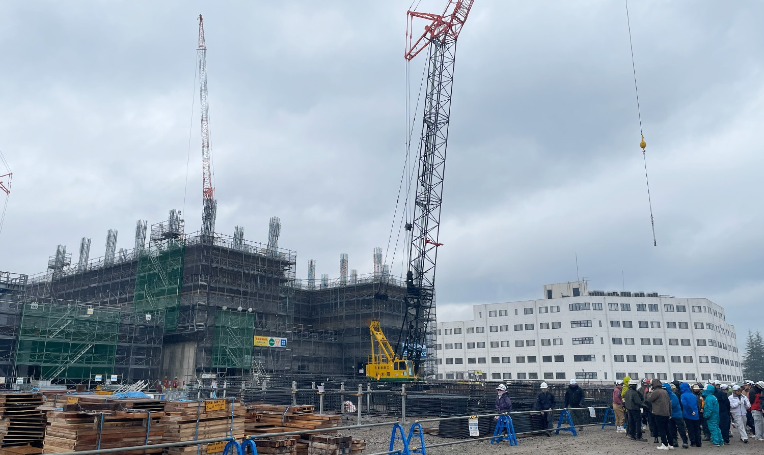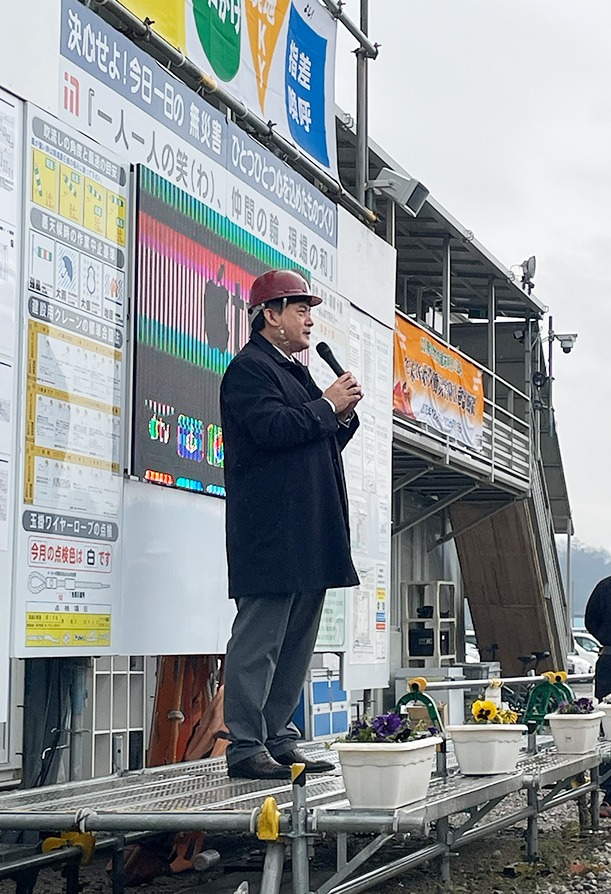 2025年12月24日(水)北福島医療センター新病院建設現場において、松本進院長が年末のご挨拶を行いました。 当日は、建設に携わる現場作業員の皆さま約190名に向けて、今年一年間、日々安全第一で工事に取り組んでいただいたこと、そして新病院建設が順調に進捗していることへの感謝の言葉を述べました。 新病院は、地域医療のさらなる充実を目指す重要な拠点として建設が進められており、多くの関係者の皆さまのご尽力に支えられています。 北福島医療センターは、引き続き関係各所と連携しながら、安全で質の高い医療環境の整備に努めてまいります。