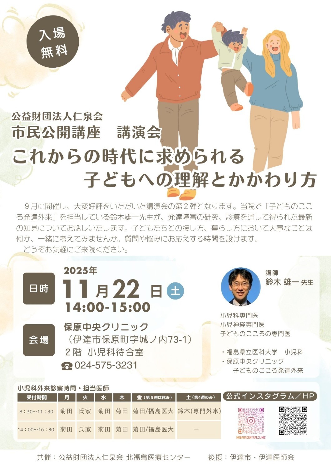 ■第2回 市民公開講座(保原中央クリニック) 講演会 ~これからの時代に求められる子どもへの理解とかかわり方~ 日時 2025年11月22日(土) 14:00~15:00(13:30受付開始) 会場 保原中央クリニック 2階 小児科待合室(福島県伊達市保原町城の内73-1) 講師 鈴木雄一先生 ・福島県立医科大学 小児科 ・保原中央クリニック 子どものこころ発達外来 その他 入場無料 申し込み不要 駐車場あり 9月に開催し、大変好評をいただいた講演会の第2弾です。 当院で「子どものこころ発達外来」を担当している鈴木雄一先生が、発達障害の研究や診療を通して得られた最新の知見についてお話しいたします。 子どもたちとの接し方や暮らし方で大切なことは何か、一緒に考えてみませんか。 ご質問やお悩みにお応えする時間も設けます。 どうぞお気軽にご来院ください。 公益財団法人仁泉会 保原中央クリニック