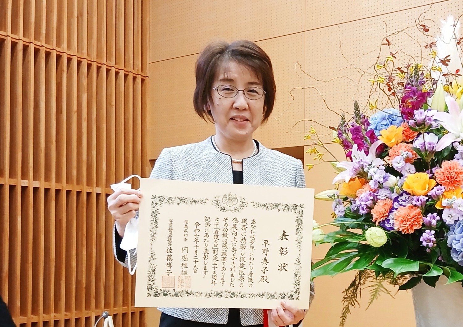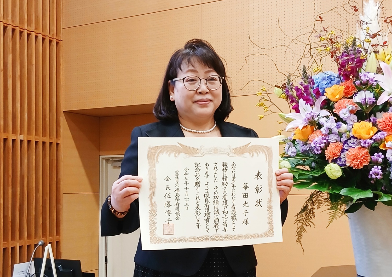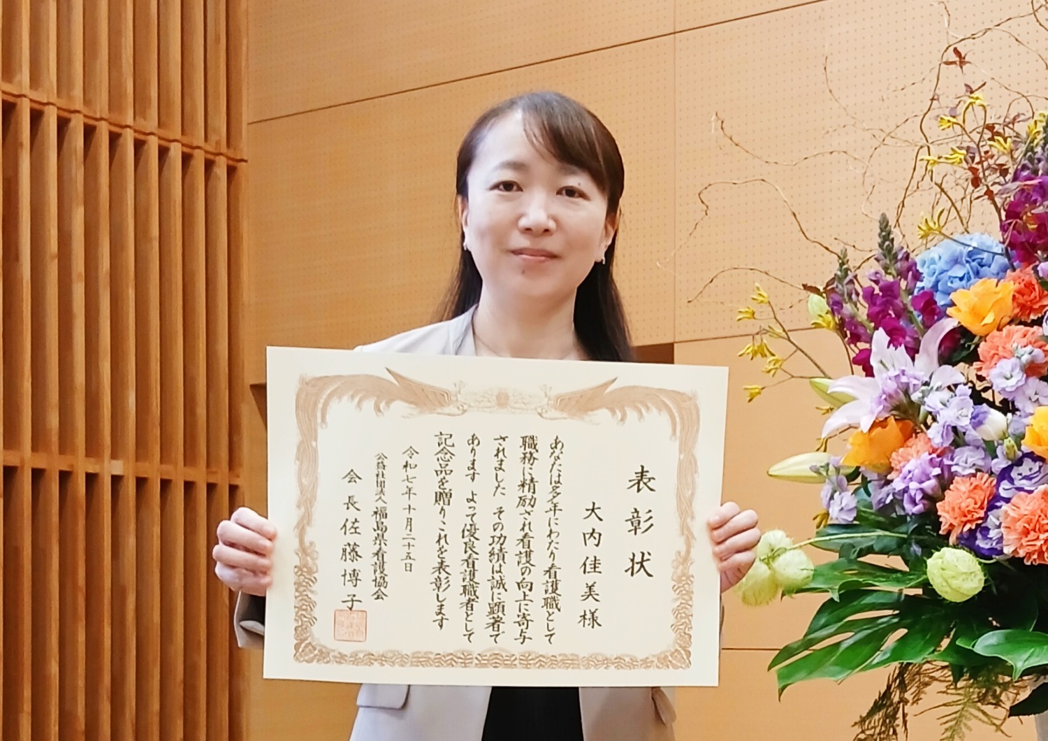 令和7年10月25日(土)、福島県看護会館みらいにて、 「看護の日」制定35周年を記念した福島県看護功労者表彰式が執り行われました。 本表彰は、看護職として長年にわたり保健・医療・福祉の発展に貢献し、 その功績が特に顕著である方々を讃えるものです。 このたび、当法人からは3名の職員が表彰を受けられました。 受賞された皆様の、これまでの看護の発展へのご尽力が高く評価され、 今回の受賞は当法人にとりましても大変名誉なことです。 職員一同、心よりお祝い申し上げます。 ここに受賞された 3名の方をご紹介いたします。 ■「看護の日」制定35周年記念 福島県看護功労者知事表彰 ※永年にわたり、県内の保健看護業務に精励し、保健医療の発展に功績が特に顕著であると認められる看護職員に対して授与されるものです。 公益財団法人仁泉会統括看護部長兼 北福島医療センター看護部長 平野 典子 ■優良看護(永年)職員表彰 ※30年以上保健看護業務に従事し、看護師として模範的で継続的な貢献がある看護職員に対して授与されるものです。 介護老人保健施設 プライムケア桃花林 2Fフロア 幕田 光子 北福島医療センター あおば病棟副師長 (皮膚・排泄ケア特定認定看護師) 大内 佳美 今後も、今回の受賞を励みに、地域医療と看護のさらなる向上に努め、 地域社会への貢献を続けてまいります。
