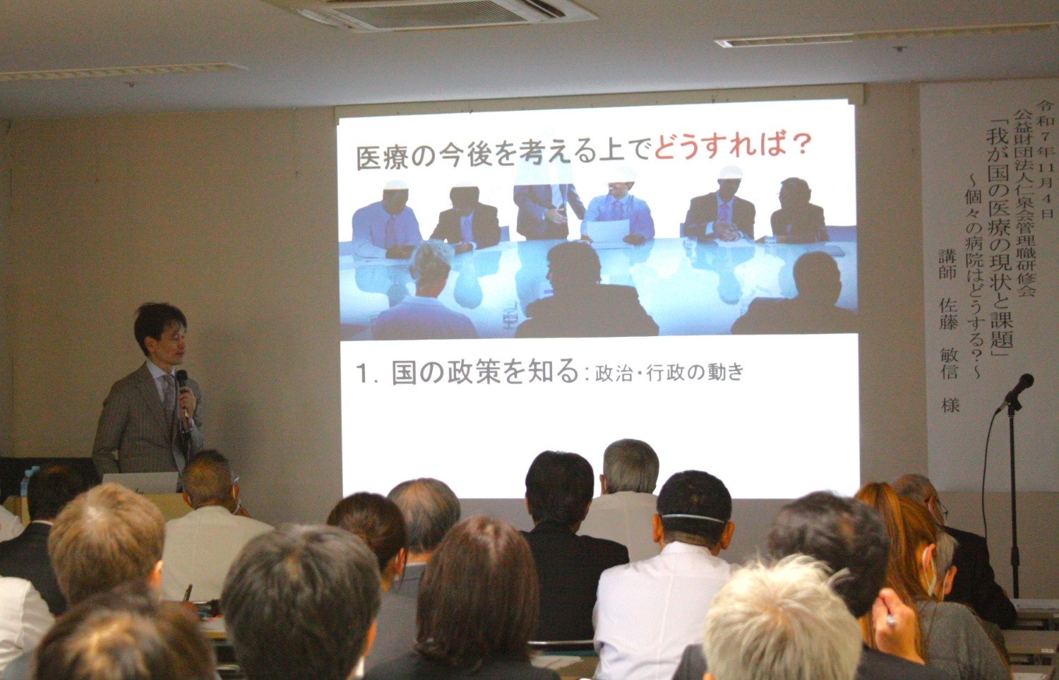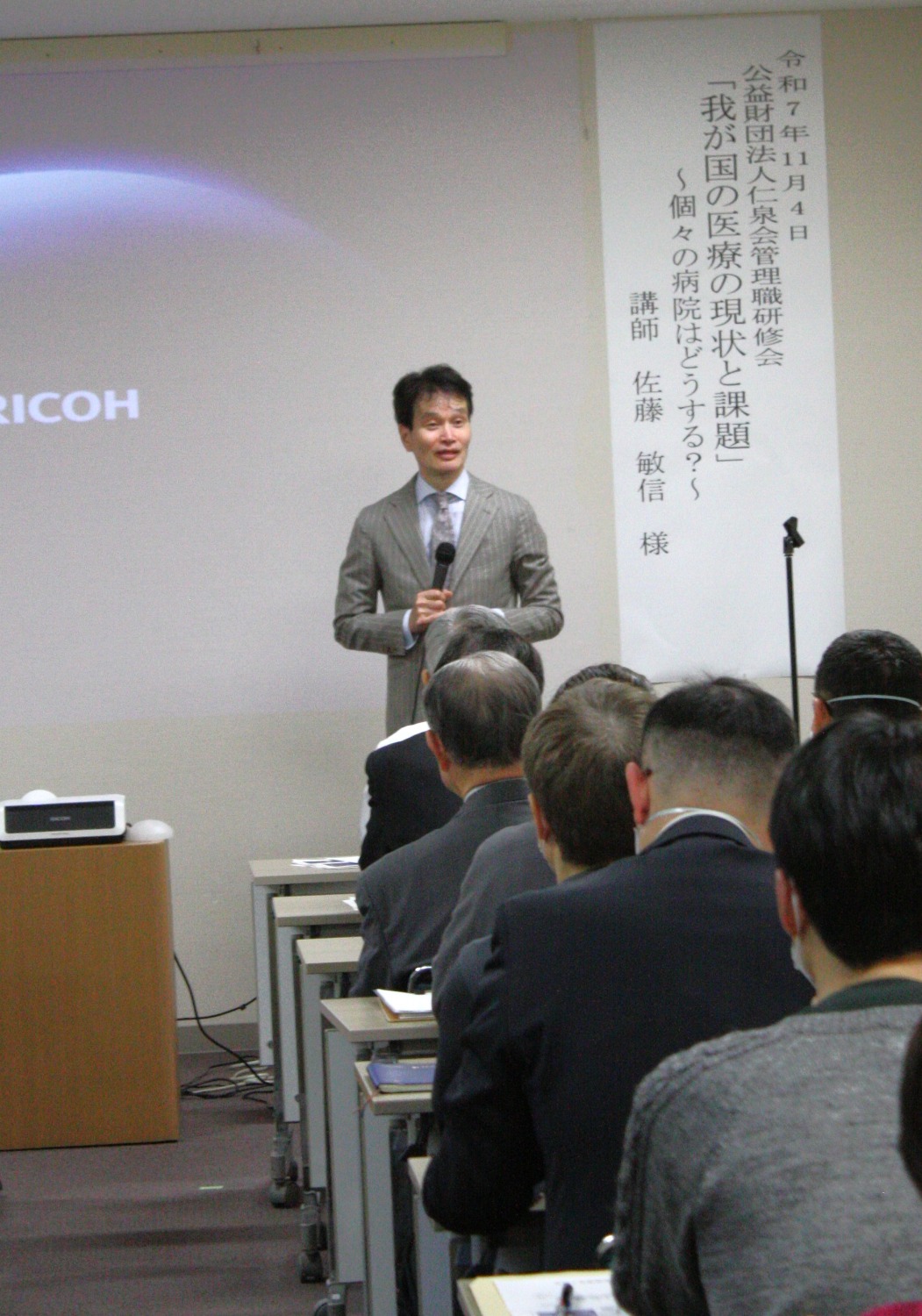 2025年11月4日(火)、法人内の各事業所管理職を対象に「管理職研修会」を開催しました。 今回の研修会では、当法人の評議員も務め、以前厚生労働省で健康局長などを歴任されていた久留米大学特命教授・佐藤敏信様を講師に迎え、「我が国の医療の現状と課題 -個々の病院はどうする?-」と題してご講演いただきました。 研修では、近年の医療および介護福祉を取り巻く情勢を踏まえ、今後の動向や課題について共有しました。また、北福島医療センター新築移転事業の進展に合わせ、法人全体として取り組むべき経営・運営の重要ポイントについて理解を深める機会となりました。