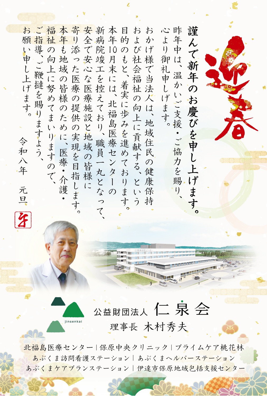 謹んで新年のお慶びを申し上げます。 昨年中は、温かいご支援・ご協力を賜り、 心より御礼申しげます。 おかげ様で当法人は、地域住民の健康保持および社会福祉の向上に貢献する、 という目的のもと、着実に歩みを進めております。 本年10月末には、北福島医療センターの新病院竣工を控えており、職員一丸となって、 安全で安心な医療施設と地域の皆様に寄り添った医療の提供の実現を目指します。 本年も地域の皆様のために、医療・介護・福祉の向上に努めてまいりますので、 ご指導、ご鞭撻を賜りますよう、お願い申し上げます。 令和八年 元旦 公益財団法人 仁泉会 理事長 木村秀夫