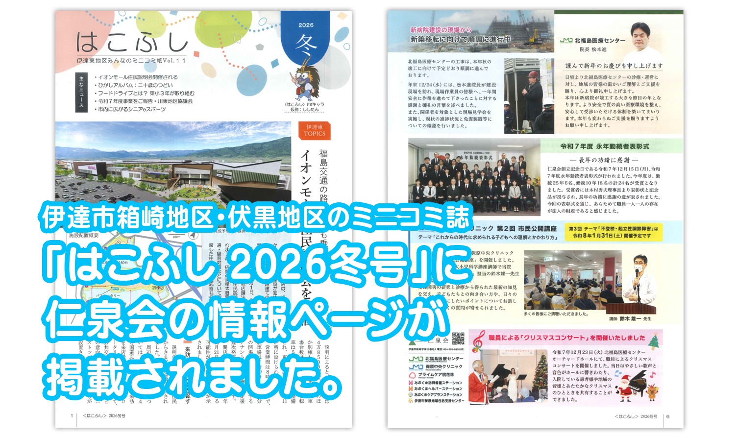 伊達市箱崎地区・伏黒地区のミニコミ誌「はこふし2026年冬号」に、公益財団法人仁泉会の情報ページが1ページ掲載されました。 本ページでは、現在進めている北福島医療センターの新築移転事業の進捗状況をはじめ、関係者による新病院建設現場の見学会の様子、院長による新年のご挨拶、永年勤続者表彰式の開催報告など、当法人の取り組みについて紹介しています。 また、保原中央クリニックにおける市民公開講座の開催報告や、今後予定している講座のご案内、職員によるクリスマスコンサートの様子など、地域の皆さまとともに歩む活動についても掲載しています。