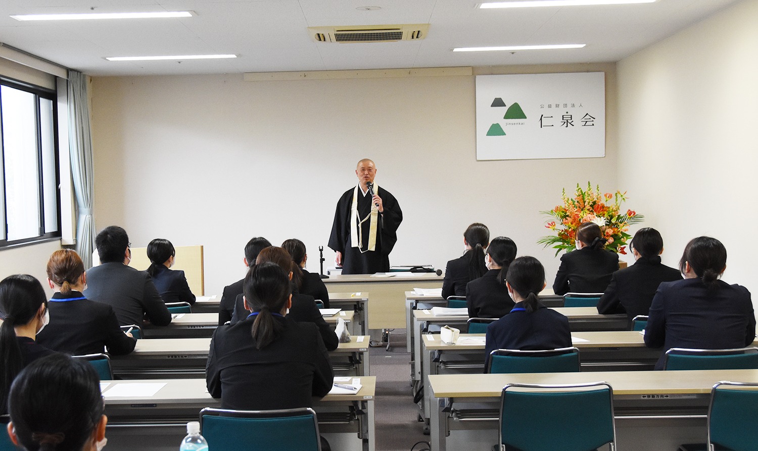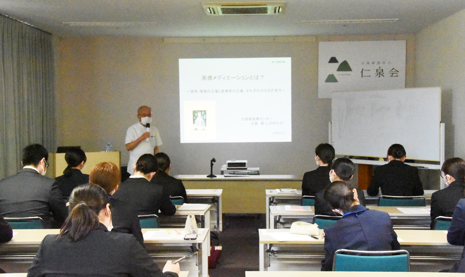 令和8年4月1日から3日までの3日間、今年度の新入職員を対象としたオリエンテーションを実施しました。 公益財団法人仁泉会では、新入職員は入職式後、全体オリエンテーションを受講したうえで、法人内の各事業所へ配属されます。 本年度のオリエンテーションでは、外部講師および法人職員による講義・研修が行われました。新入職員達は、社会人としての基本的な考え方やビジネスマナーに加え、仁泉会職員としての自覚、専門職として目標を持ち努力することの大切さについて理解を深めました。 【研修内容】 特別講和 「笑顔で働くためのプラス発想」~ストレス社会に生かす仏教の知恵~ 仁泉会理事 石井祐聖様(福厳寺住職) 研修①「コンプライアンスについて」 社会保険労務士 宍戸 宏之 様 研修②「働く人のメンタルヘルスについて」 精神看護専門看護師 加藤 郁子 様 研修③「ビジネスマナー・ハラスメントについて」 株式会社クリフ 代表取締役 石山 純恵 様 研修④「コンフリクト・マネジメントと医療メディエーション」 志賀 隆 名誉院長(北福島医療センター)